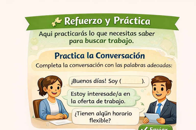 Practica situaciones reales para buscar trabajo: conversaciones, llamadas, mensajes y entrevistas.